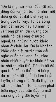 ấy một làn gió mới, một luồng sinh khí mới được Klinsmann thổi vào đội tuyển. Các cổ động viên thì hài lòng với màn ra mắt của Klinsmann. McGinness, một người từ bang Virgina đến Philadenphia để xem trận đấu này nói rằng: “Tôi rất thích việc anh ấy mang vào đội tuyển những cầu thủ trẻ. Đó là sự thay đổi tốt”. Còn người luôn đồng hành cũng mỗi trận đấu của đội Mỹ , Mahoney, thì phấn khởi nói về Klinsmann “Anh ấy là một tiền đạo và là một HLV mang phong cách tấn công. Hy vọng rằng, trong hai hay ba năm tới, chúng tôi sẽ đạt được điều mà chúng tôi nghĩ rằng chúng tôi sẽ có: một hệ thống tấn công hơn , bởi lẽ đó cũng là những gì anh ấy muốn xây dựng nên”.