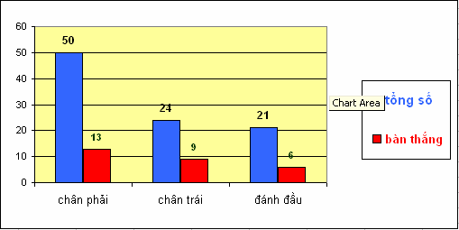 Tuy dứt điểm bằng chân phải nhiều nhất nhưng khả năng thành bàn trong những lần dứt điểm với chân trái hay đánh đầu lại cao hơn. Tuy vậy, mức độ hiệu quả đều nhỏ hơn 40%.