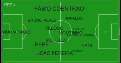 Pereira, Pepe, Alves, Coentrao Miguel Moutinho, Meireles (80. Varela) Nani, Postiga (70. Oliveira), Ronaldo |