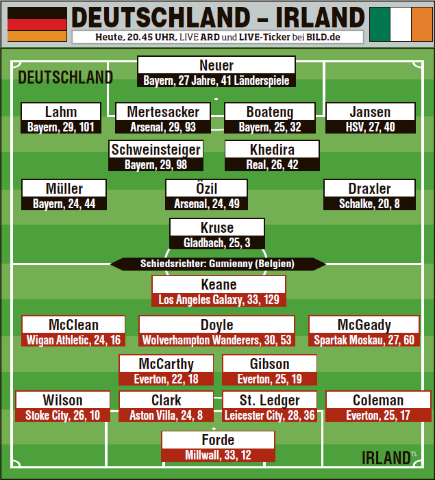 Trước trận đấu này, đội khách Cộng hòa Ireland vừa mới sa thải HLV Giovanni Trapattoni tháng trước sau những thất bại trước Áo và Thụy Điển. Và hiện tại, Noel King – HLV tuyển U21 tạm thời đang dẫn dắt đội bóng. Phải làm khách trên đất Đức ở ngay lần đầu tiên dẫn dắt đội tuyển Ireland sẽ là một nhiệm vụ khó khăn giành cho HLV King. Càng khó khăn hơn khi vị tân HLV này không thể có được sự phục vụ của hậu vệ CLB Stoke City – Jon Walters và thủ môn Kieren Westwood của Sunderland vì chấn thương. Chưa kể khả năng ra sân của tiền đạo kỳ cựu Robbie Keane còn để ngỏ khi anh bị đau sau buổi tập hôm thứ 4.