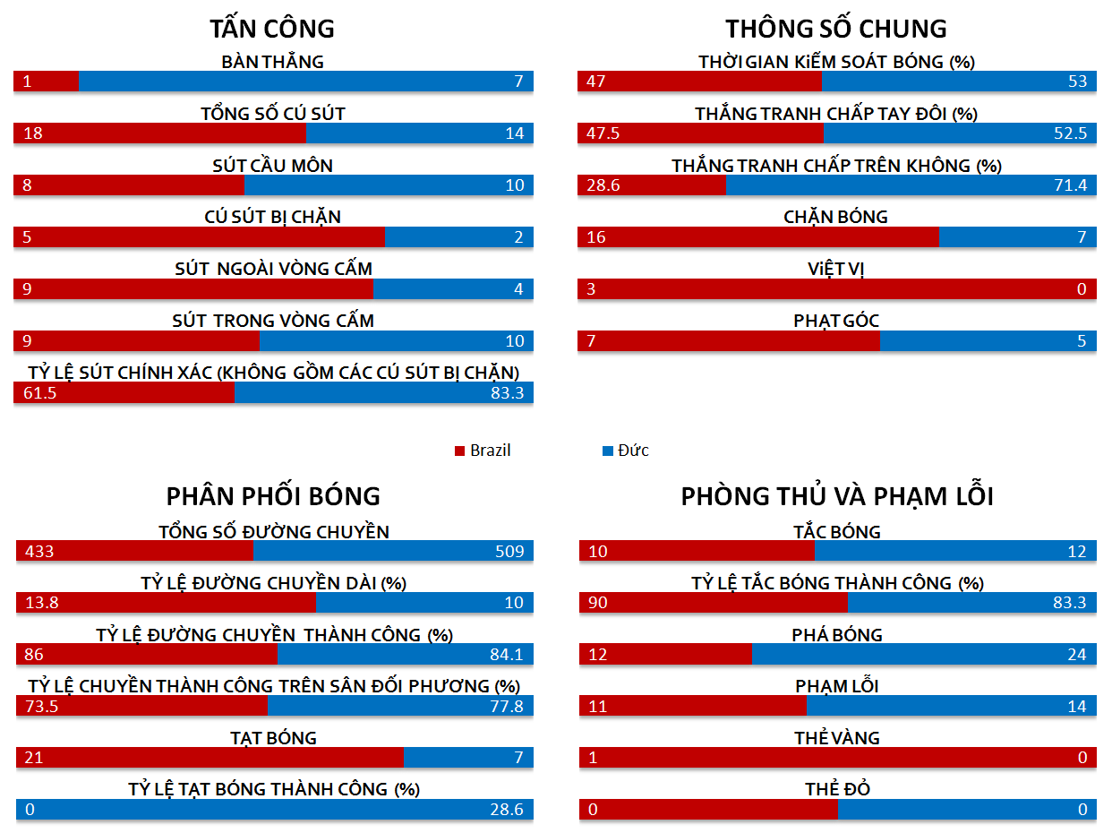 Thua đậm 0-5 ngay trong hiệp 1 khiến những điều chỉnh của Scolari trong hiệp 2 cũng trở nên vô nghĩa. Tuyển Đức chủ động thi đấu giữ chân trong hiệp 2 nhưng vẫn đủ sức ghi thêm 2 bàn nữa nhờ công của Schürrle. Oscar, sau những nỗ lực không mệt mỏi và khiến Neuer hoạt động rất vất vả, kịp ghi bàn danh dự cho chủ nhà ở phút cuối cùng của trận đấu để khép lại một đêm đáng quên của Brazil.