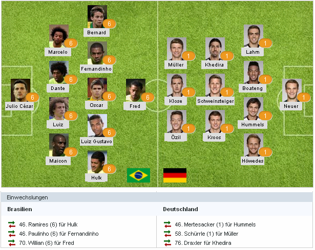 0:1 Th. Müller (11.)![]() 0:2 Klose (23.) ![]() 0:3 Kroos (24.) ![]() 0:4 Kroos (26.) ![]() 0:5 Khedira (29.) ![]() 0:6 Schürrle (69.) ![]() 0:7 Schürrle (79.) ![]() |