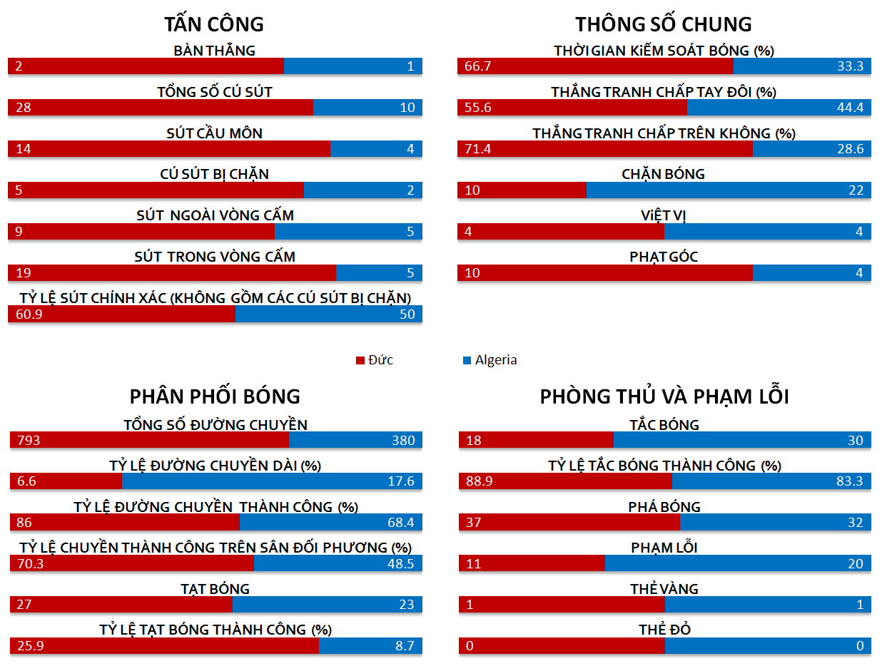 Phút 92, cú đánh gót đẹp mắt của Schürrle sau đường chuyền vào của Müller giúp Đức khai thông bế tắc. Sau bàn thắng, cùng với việc thể lực bị giảm sút, Algeria không còn gây được khó khăn cho Đức nữa. Đến phút 120, Özil nhân đôi cách biệt cho Đức ngay trước khi Djabou kịp ghi bàn danh dự cho Algeria. Chật vật vượt qua Algeria, Đức lọt vào vòng tứ kết và sẽ gặp tuyển Pháp vào lúc 23h ngày 4/7 tới.