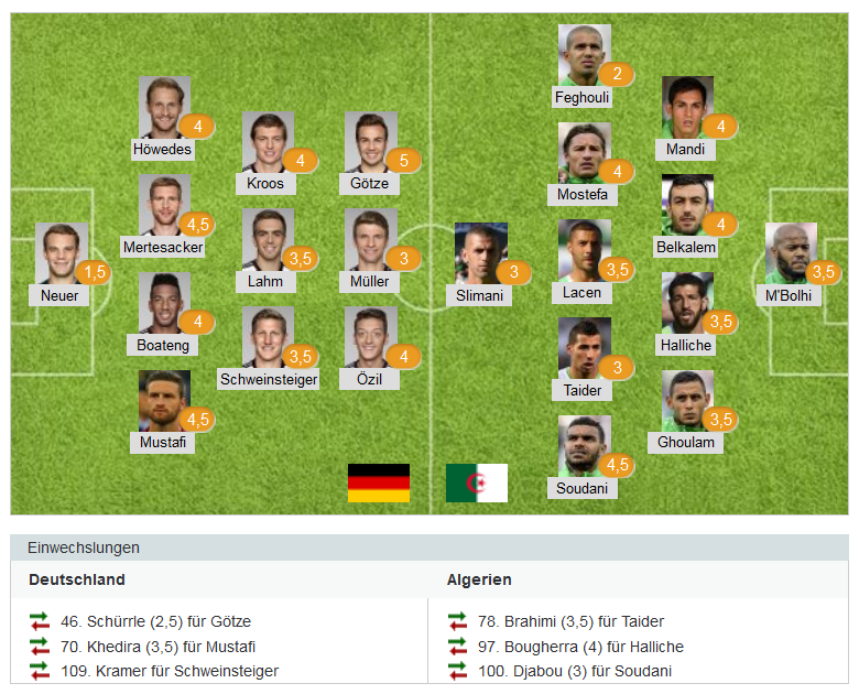 Nếu như hàng công Đức tỏ ra vô duyên thì sự xuất sắc của thủ môn M’Bolhi (người được bầu là cầu thủ hay nhất trận) cũng như thủ môn Neuer chính là các lý do khiến cho 2 đội phải cần thêm 30 phút của hiệp phụ để giải quyết trận đấu.